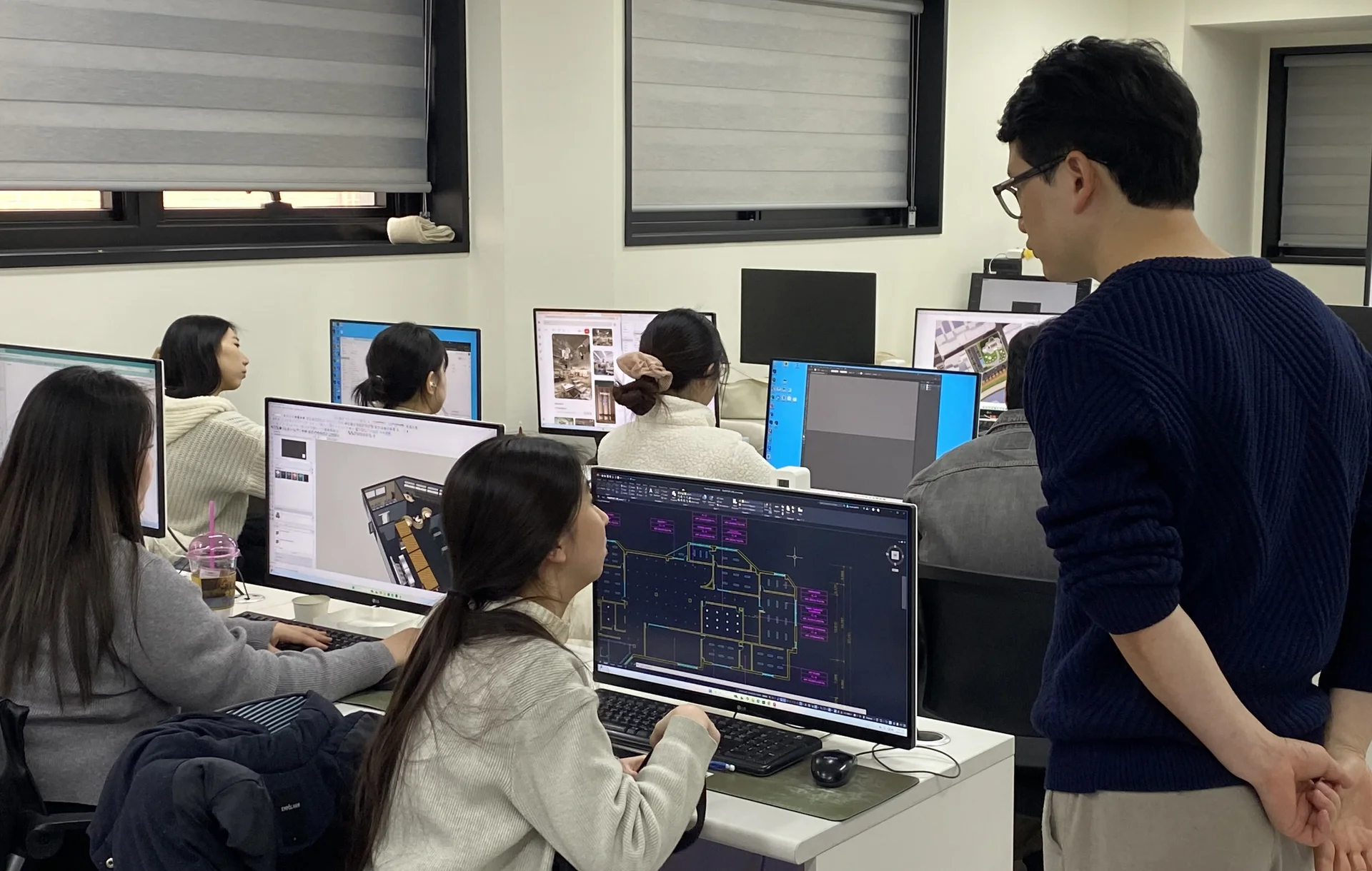 단순히 툴 사용법을 알려주는 수업이 아닙니다. 현장에서 어떤 순서로 공간이 만들어지는지, 어떤 논리로 설계 결정을 내리는지를 직접 경험하게 합니다. 수강생들의 결과물 완성도가 높아지는 핵심 이유입니다.