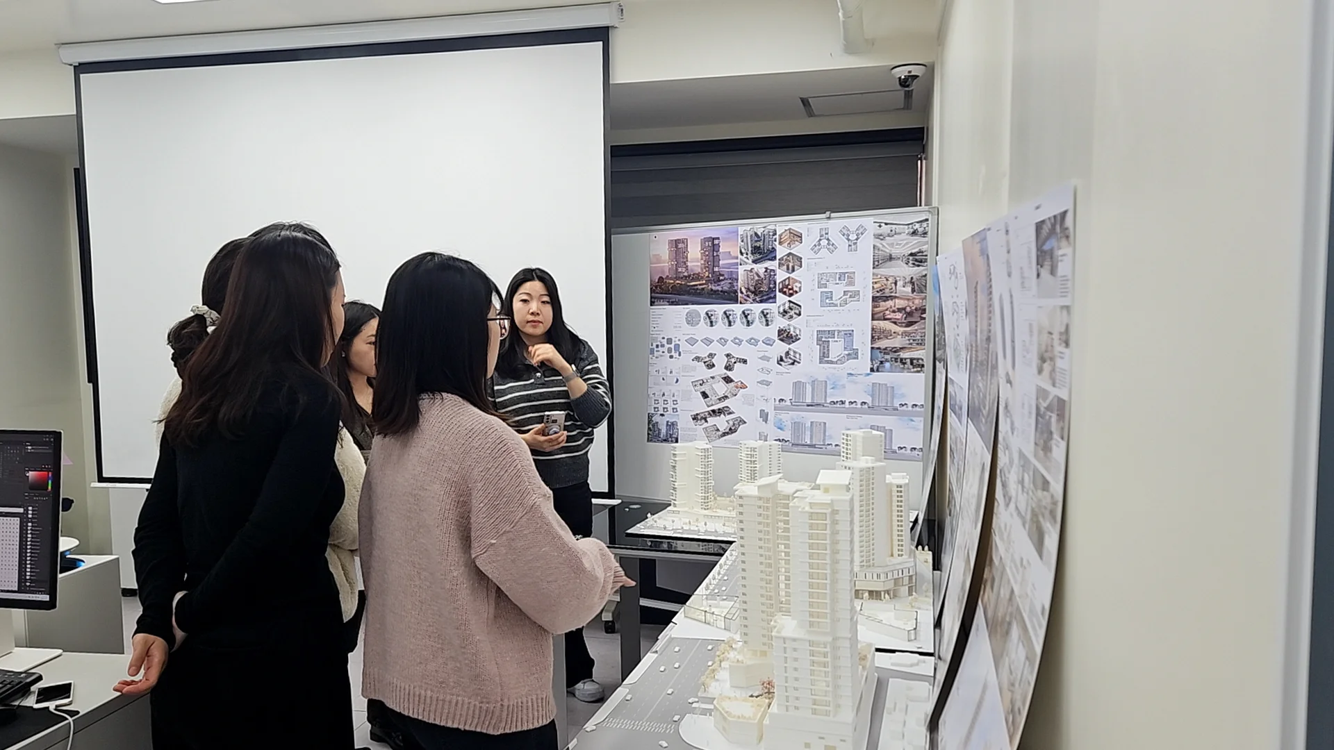 "포옹"이라는 콘셉트에서 출발한 두 매스의 배치가 중정을 만들고, 그 중정이 커뮤니티 동선으로 이어지는 구조 — 형태와 기능이 하나의 이야기로 연결된 설계였습니다. 인원이 3명으로 가장 적었음에도 완성도는 높았습니다.