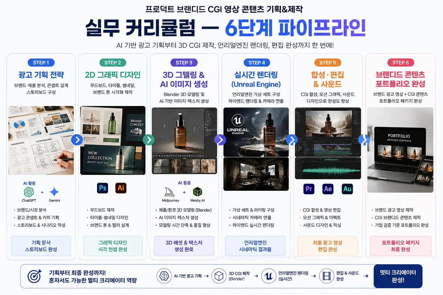이 파이프라인을 완주하면 AI 기반 광고 기획 → 3D CGI 제작 → 언리얼엔진 렌더링 → 편집 완성까지 혼자 처리할 수 있는 멀티 크리에이터 역량이 생긴다.