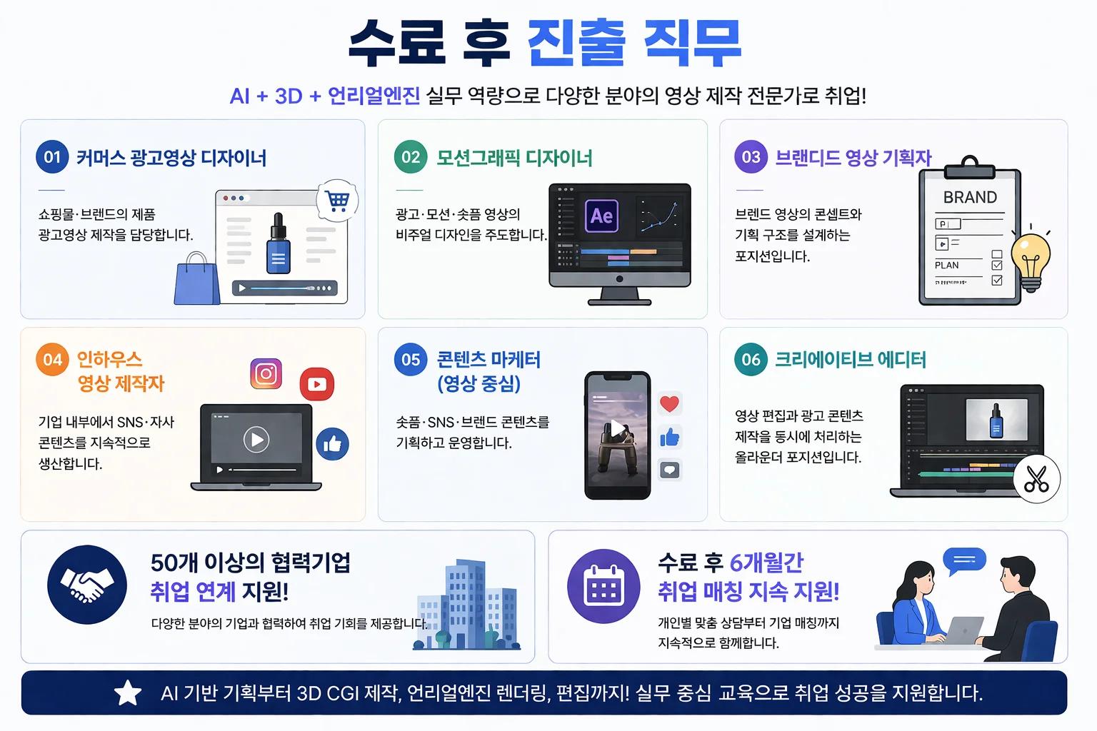 50개 이상의 협력기업 취업 연계가 지원되며, 수료 후 6개월간 취업 매칭이 지속적으로 이루어진다.