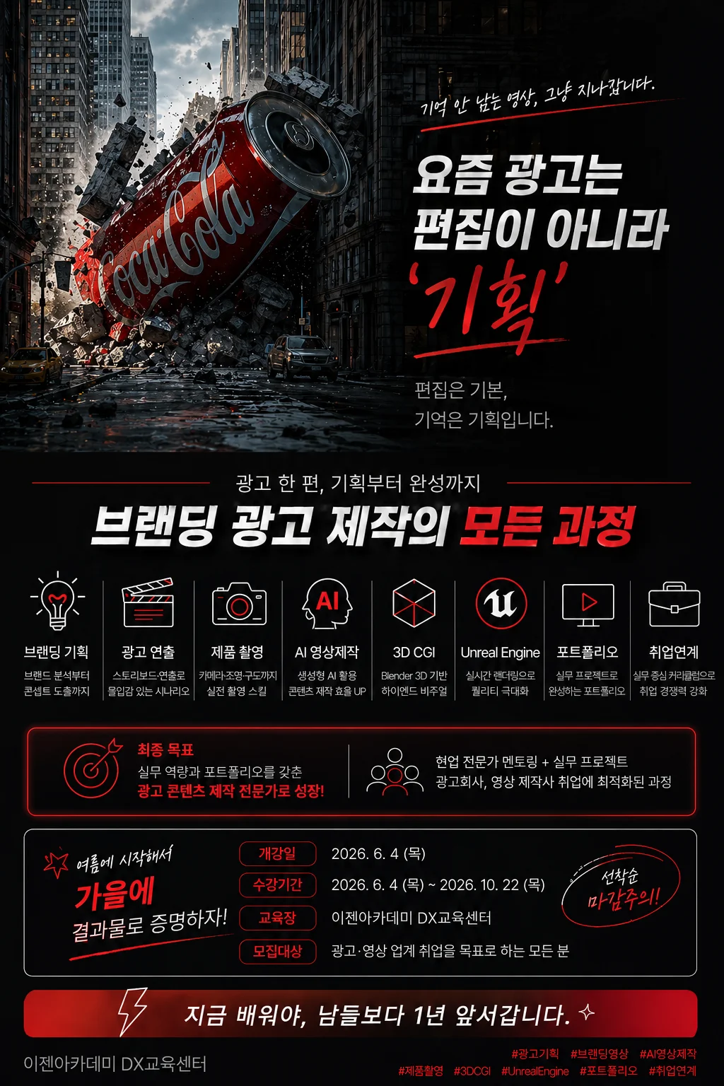 글로벌 광고 시장에서는 이미 CGI가 표준이 됐고, 국내 대형 광고주들도 빠르게 CGI 중심으로 제작 방식을 전환하고 있다. 이 흐름에서 경쟁력을 갖추려면 3D 툴과 AI를 함께 다룰 수 있어야 한다.