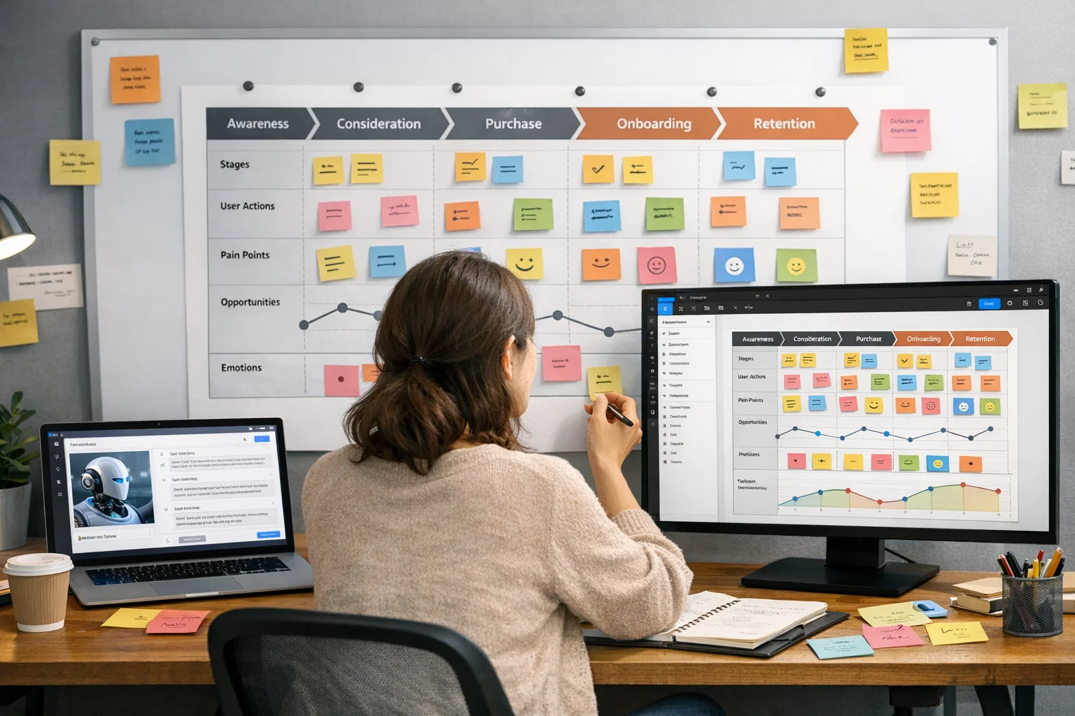 이 단계에서 생성형 AI는 강력한 조력자가 됩니다. 인터뷰 스크립트 초안 작성, 데이터 요약, 경쟁사 분석 초안을 AI가 처리하면 디자이너는 인사이트의 질에 집중할 수 있습니다.