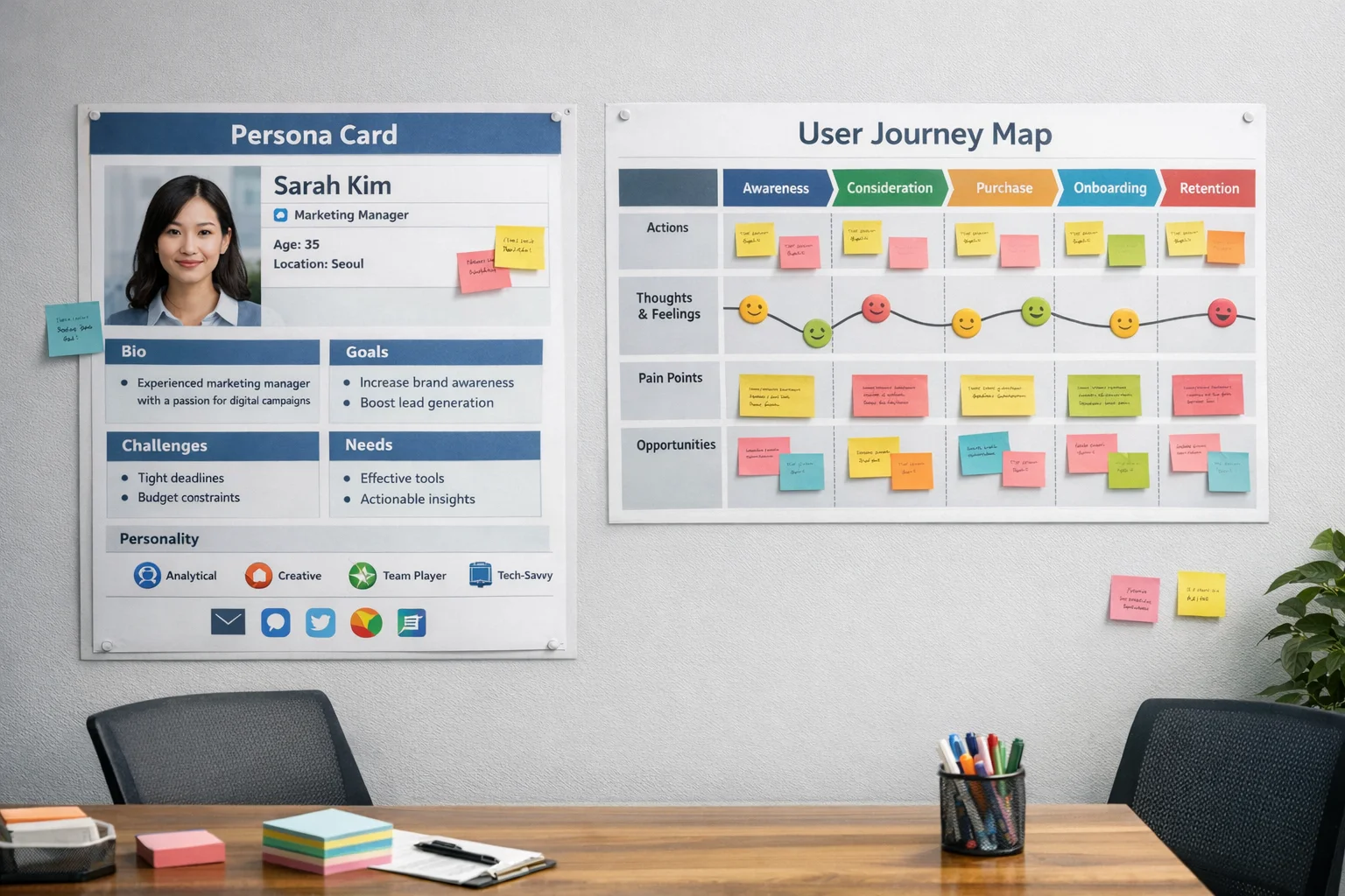 페르소나 — 주요 사용자 유형을 구체적인 가상 인물로 표현. 팀 전체가 "누구를 위해 만드는가"를 같은 그림으로 공유하게 해줍니다